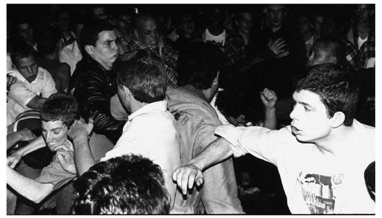 Up until 1981 or so, dancing at punk shows had typically consisted of jumping up and down in one place, otherwise known as “pogoing”. But hardcore punks turned dancing into a sporting event. They formed what came to be known as “The Pit”: a ferocious ring of codified violence, where kids worked up a frenzied sweat, launching themselves into a whirlwind of bodies, risking broken bones and bloody gashes, especially if you didn’t know what you were doing. You could be punished for being in the pit, which made it all the more exciting.